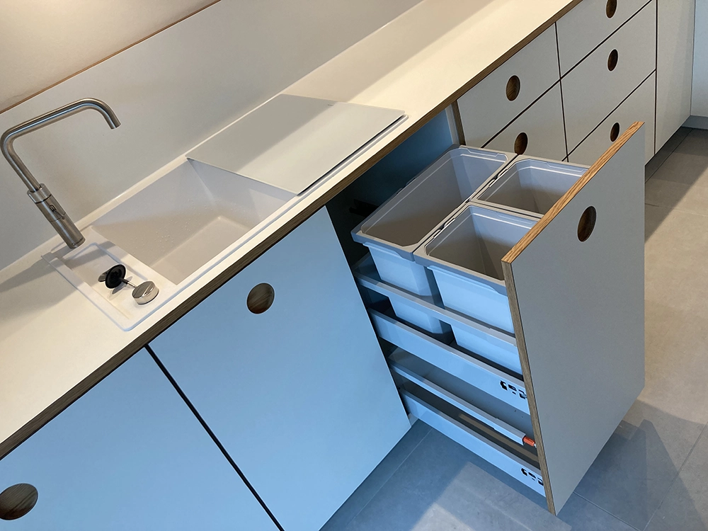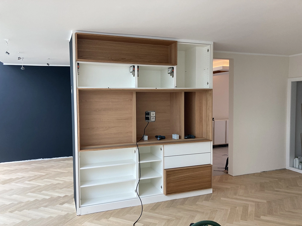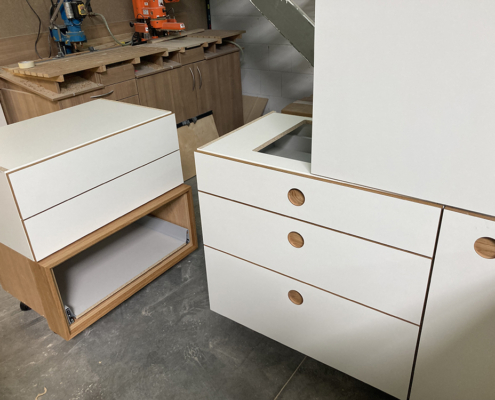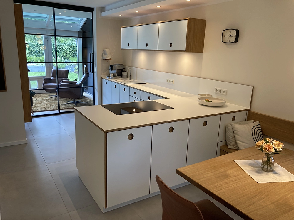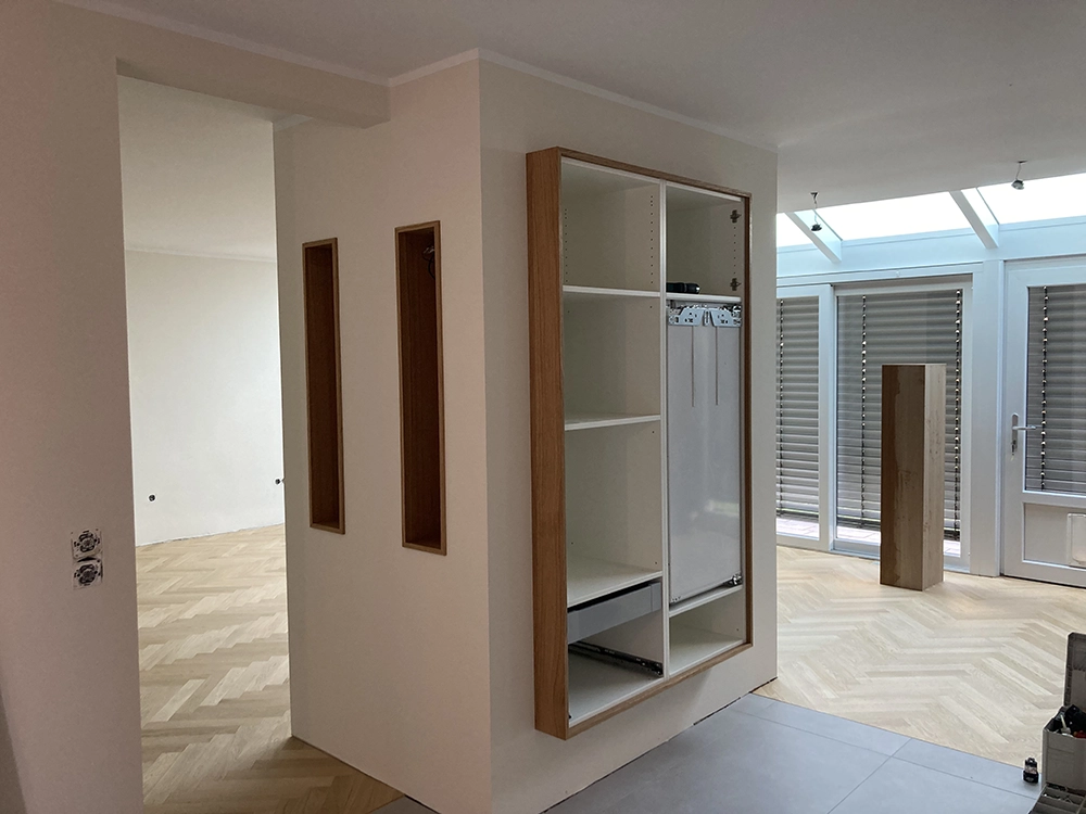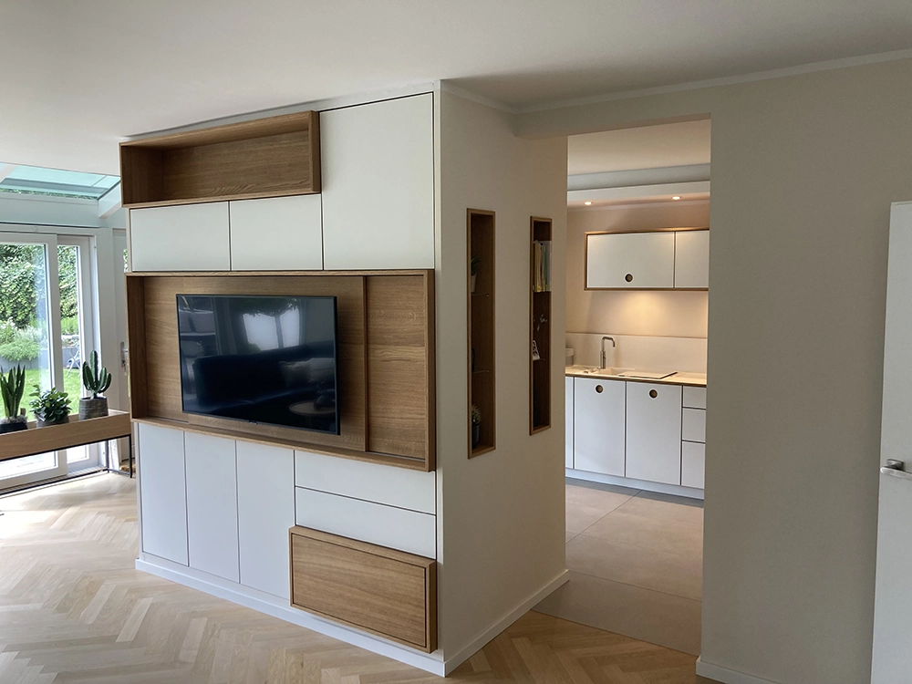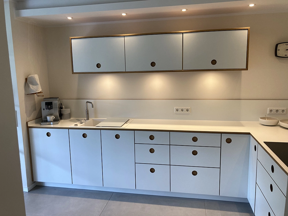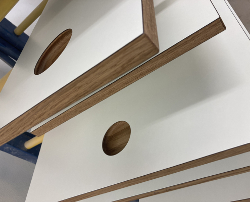 Wir möchten Ihnen gerne den beispielhaften Prozess hinter einem unserer Kundenprojekte vorstellen und so Einblicke in unsere Arbeit gewähren. In diesem Fall haben wir einen kompletten Raum individuell geplant und umgesetzt – selbstverständlich wie immer in Stückzahl 1. Eine Besonderheit war dabei die eigens entwickelte Grifflösung: selbst gefräste Griffmuscheln, die mit HPL. beschichtet wurden. An diesem Projekt zeigen wir Ihnen Schritt für Schritt, wie aus einer Idee ein maßgeschneiderter Raum mit einzigartigem Charakter entsteht.